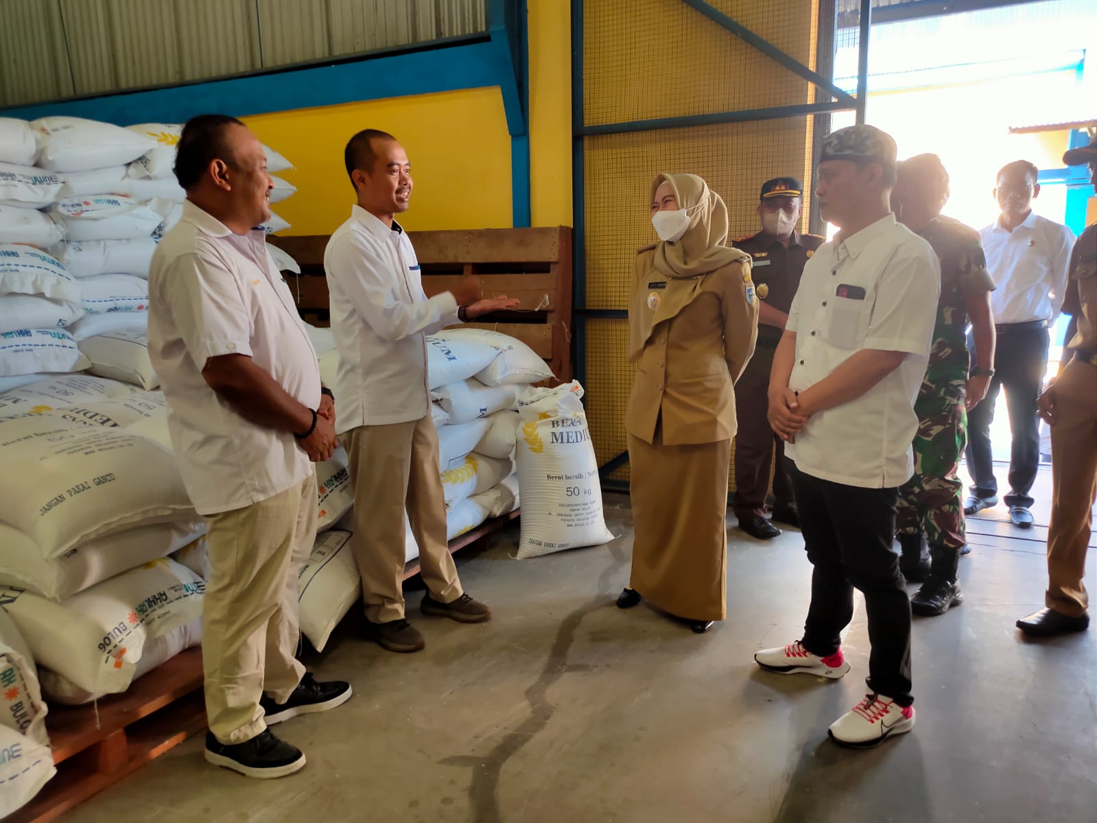 Demak – Menjelang Hari Raya Idul Fitri 1444 H, Bupati Demak Eisti’anah bersama Kapolres Demak AKBP Budi Adhy Buono mengecek ketersedian beras di gudang Bulog Demak serta memantau harga kebutuhan pokok masyarakat (Kepokmas) di Pasar Karanganyar, Senin (10/4/2023).