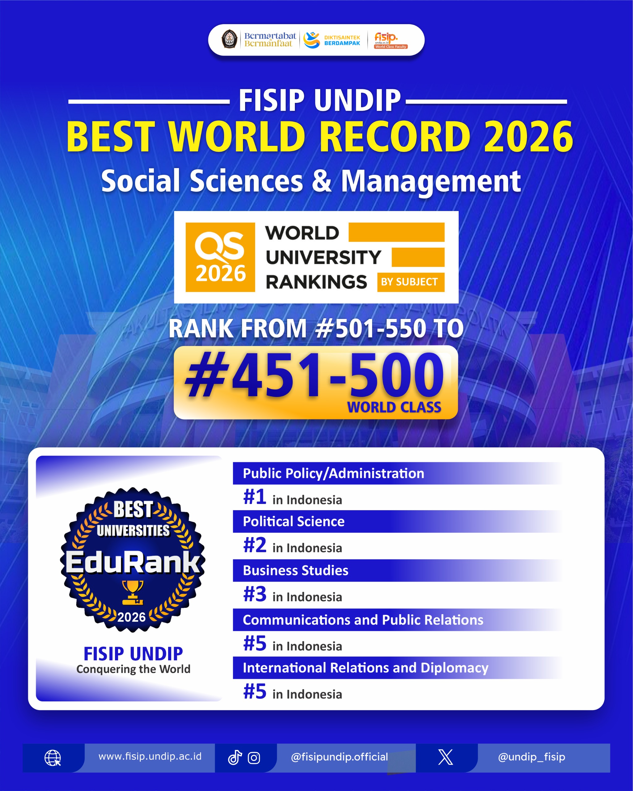 Momentum ini kian diperkuat oleh capaian EduRank 2026 yang menempatkan program studi di lingkungan FISIP Undip dalam jajaran lima besar terbaik di Indonesia menurut bidang ilmunya. Ilmu Administrasi Publik menempati peringkat 1 nasional, Ilmu Pemerintahan peringkat 2, Ilmu Administrasi Bisnis peringkat 3, Ilmu Komunikasi peringkat 4, dan Ilmu Hubungan Internasional peringkat 5.
