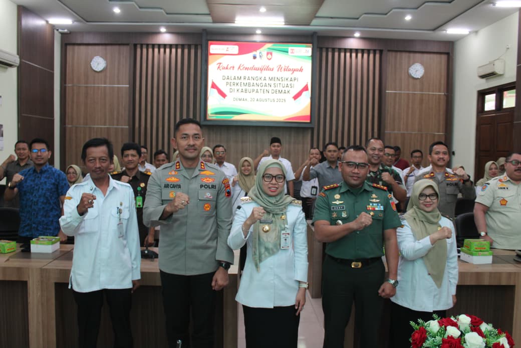DEMAK – Forum Koordinasi Pimpinan Daerah (Forkopimda) Kabupaten Demak menggelar Rapat Koordinasi (Rakor) Kondusifitas Wilayah di Gedung Grhadika Bina Praja, Rabu (20/8/2025) siang. Pertemuan ini berfokus pada langkah strategis menjaga stabilitas keamanan dan ketertiban masyarakat di tengah dinamika situasi yang berkembang.