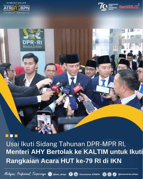 Jakarta – Usai mengikuti Sidang Tahunan MPR RI dan Sidang Bersama DPR RI-DPD RI Tahun 2024 di Jakarta pada Jumat (16/08/2024), Menteri Agraria dan Tata Ruang/Kepala Badan Pertanahan Nasional (ATR/BPN), Agus Harimurti Yudhoyono (AHY) bertolak menuju Kalimantan Timur (Kaltim), tepatnya Kota Balikpapan. Kunjungannya kali ini, dalam rangka mengikuti rangkaian Hari Ulang Tahun (HUT) ke-79 Kemerdekaan Republik Indonesia di Ibu Kota Nusantara (IKN).
